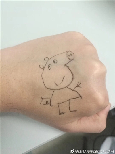 “偶然间,发现有小朋友的袜子忘在诊室了,粉红色的袜子上印着小猪佩奇。”杨磊回忆。对于小猪佩奇,杨磊并不陌生,家里已经有了小朋友,小猪佩奇是杨磊小孩最喜欢的卡通人物之一。杨磊灵机一动,决定在左手手背上画一个小猪佩奇。